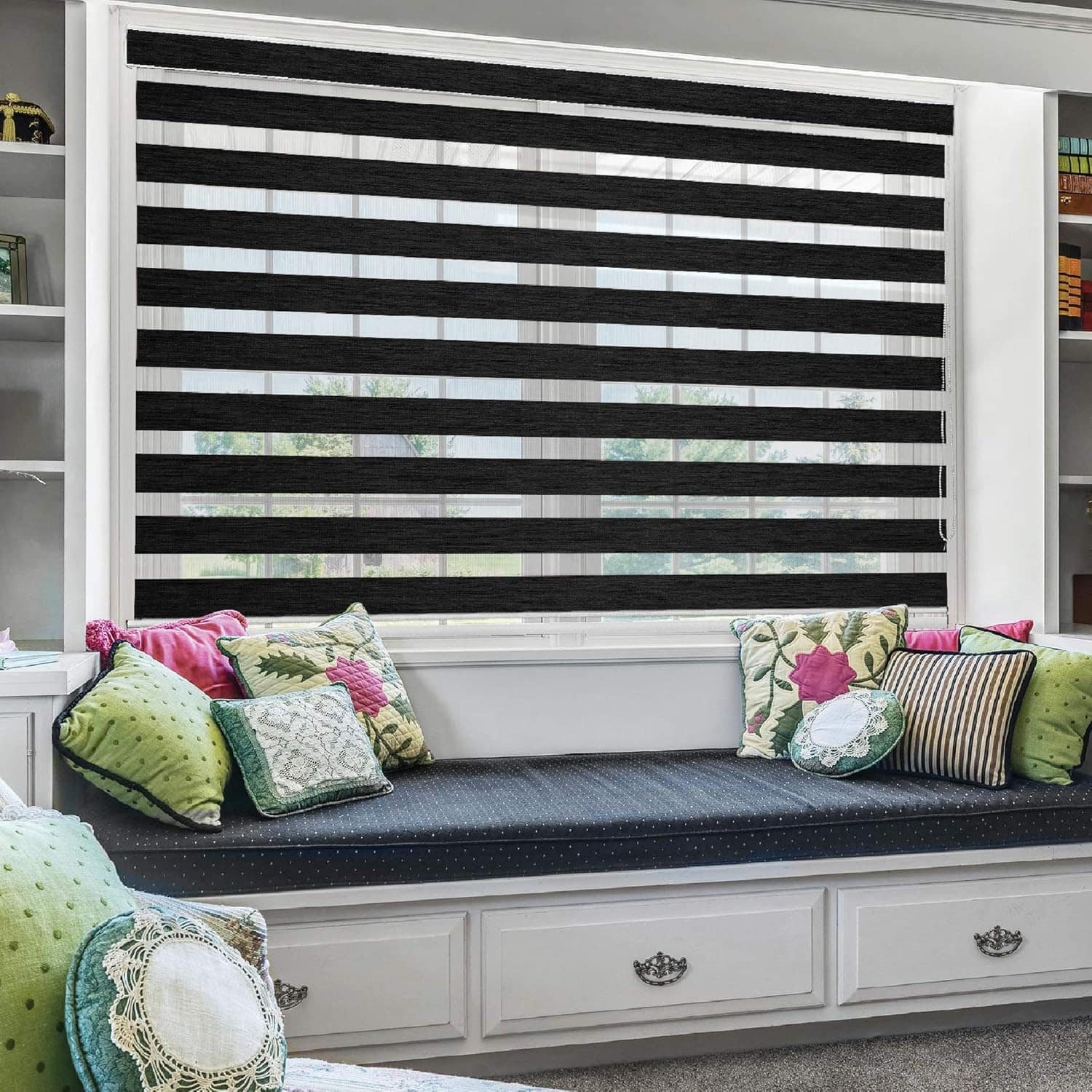 A contemporary roller shade solution that transitions seamlessly from full light exposure to complete privacy with a simple chain pull.